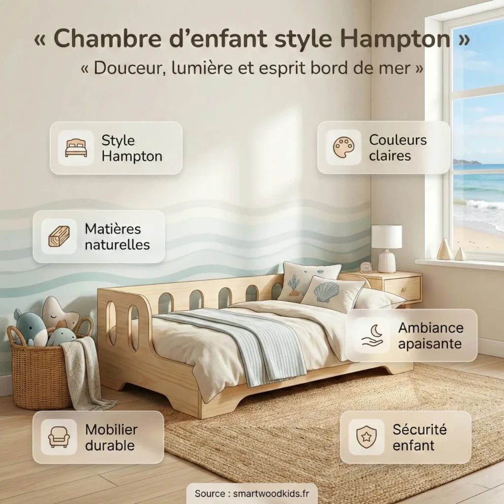 Pour résumer, aménager une chambre d’enfant style Hampton, c’est marier l’élégance côtière et la praticité pour créer un espace à la fois apaisant, lumineux et vraiment fonctionnel. Couleurs claires, matières naturelles (bois, lin, coton) et mobilier sûr, durable et bien pensé : voilà les bases. L’idéal, c’est une chambre qui inspire la sérénité, laisse de la place au jeu et évolue facilement avec votre enfant.