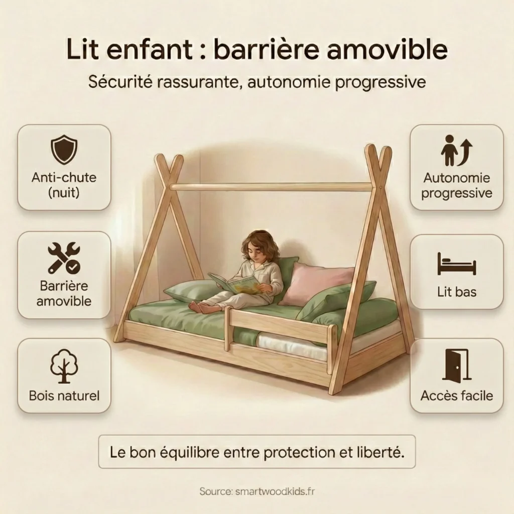 Ces petits plus font du lit avec barrière latérale amovible un choix malin pour les familles qui veulent sécurité, autonomie et praticité.