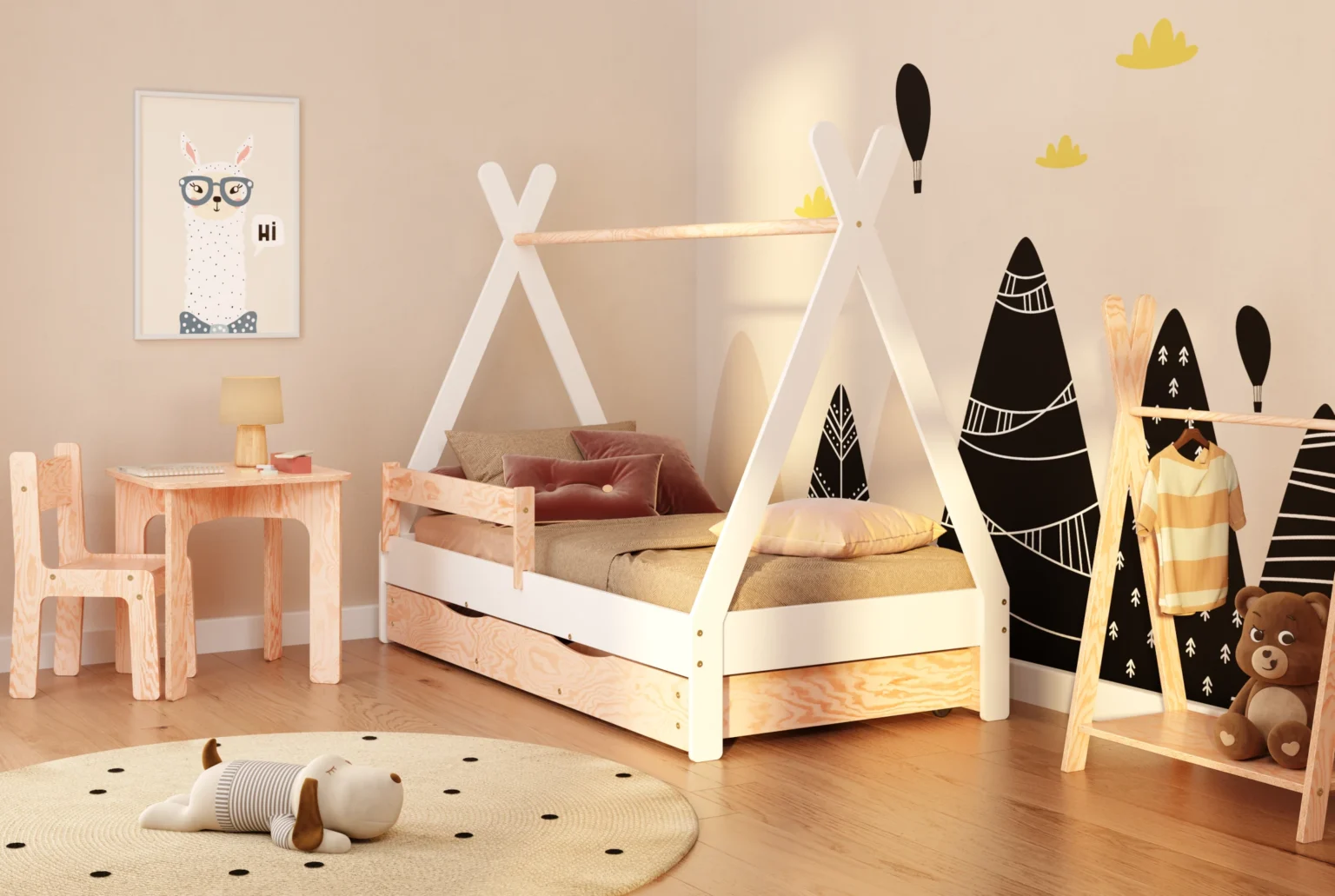 Privilégiez les matériaux naturels, sûrs et durables. Le bois massif (comme le pin certifié FSC) est top : solide, écologique. Vérifiez que les peintures et vernis sont bien écologiques, non toxiques, et adaptés à un usage enfant et clairement documentés par le fabricant. Évitez tout ce qui pourrait dégager des produits chimiques nocifs (COV).