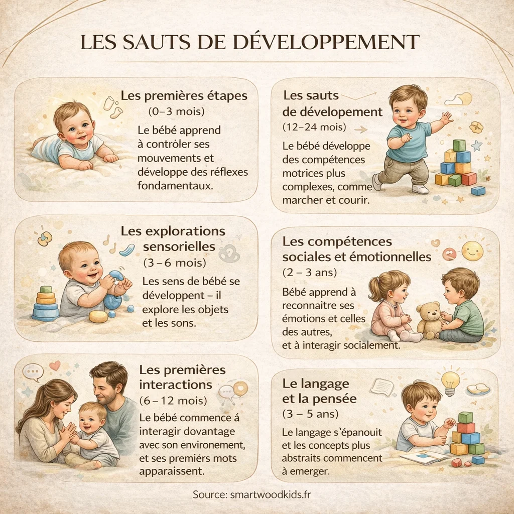 Ah, le monde des bébés ! Une aventure incroyable, pleine de surprises… et de ces fameux « sauts de développement ». Imaginez votre tout-petit qui passe d’une étape à une autre presque du jour au lendemain. Pendant ces périodes, il ne grandit pas seulement physiquement : il progresse surtout sur le plan mental, en créant de nouvelles connexions dans son cerveau. Ce n’est pas toujours une évolution régulière : parfois, c’est un vrai bond — un « saut » — qui ouvre de nouvelles possibilités. Voyons ensemble ce que sont ces sauts, comment repérer que votre bébé en traverse un, et surtout comment l’accompagner au mieux pendant ces moments charnières.