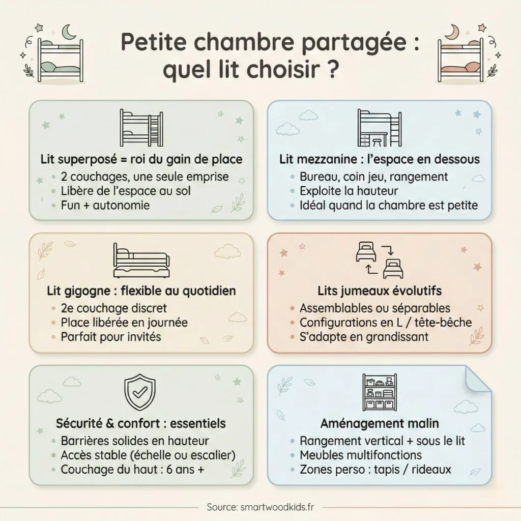 En général, les lits superposés et les lits mezzanines sont les plus malins pour gagner de la place au sol dans une petite chambre. Les lits gigognes sont aussi top si un deuxième couchage n’est utile qu’à l’occasion, car ils libèrent de l’espace le jour. Les lits modulaires ou combinés, qui intègrent bureau et rangements, sont également très efficaces. L’important, c’est de choisir un lit sûr, pratique et adapté à l’âge et aux besoins de vos enfants.
