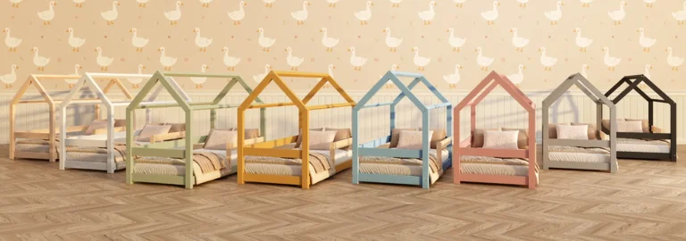 Lits pour enfants en bois de pin en forme de maison disponibles en différentes couleurs avec des barrières latérales