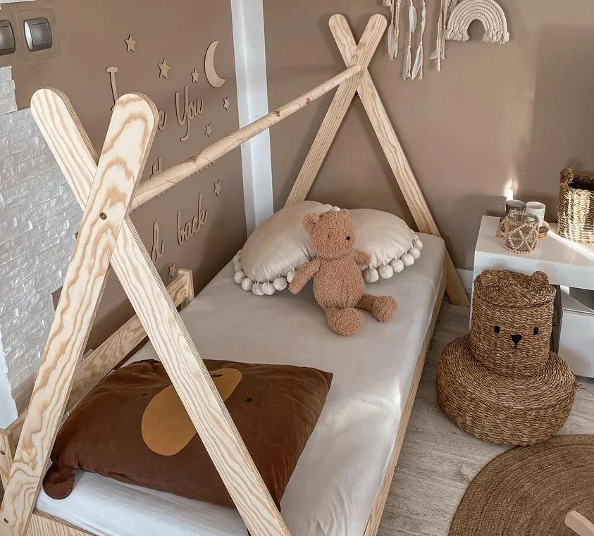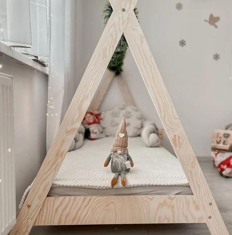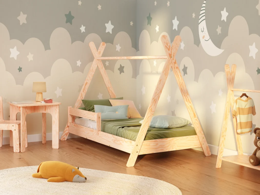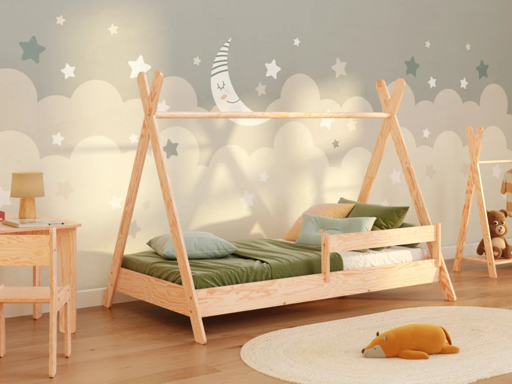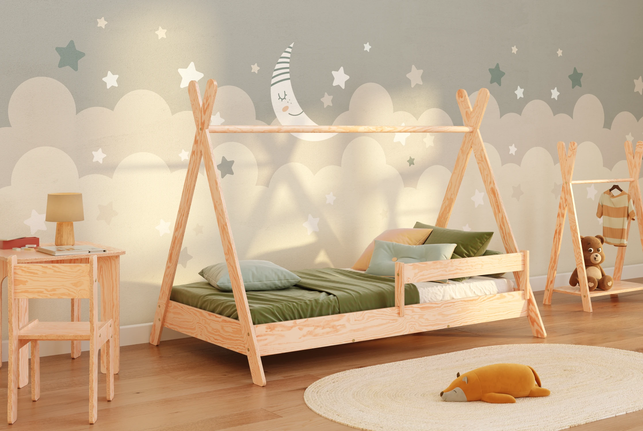 Lit cabane TIPI est une structure classique en forme de tipi montée sur pieds, surélevant légèrement l’espace de couchage et facilitant ainsi le nettoyage sous le lit.