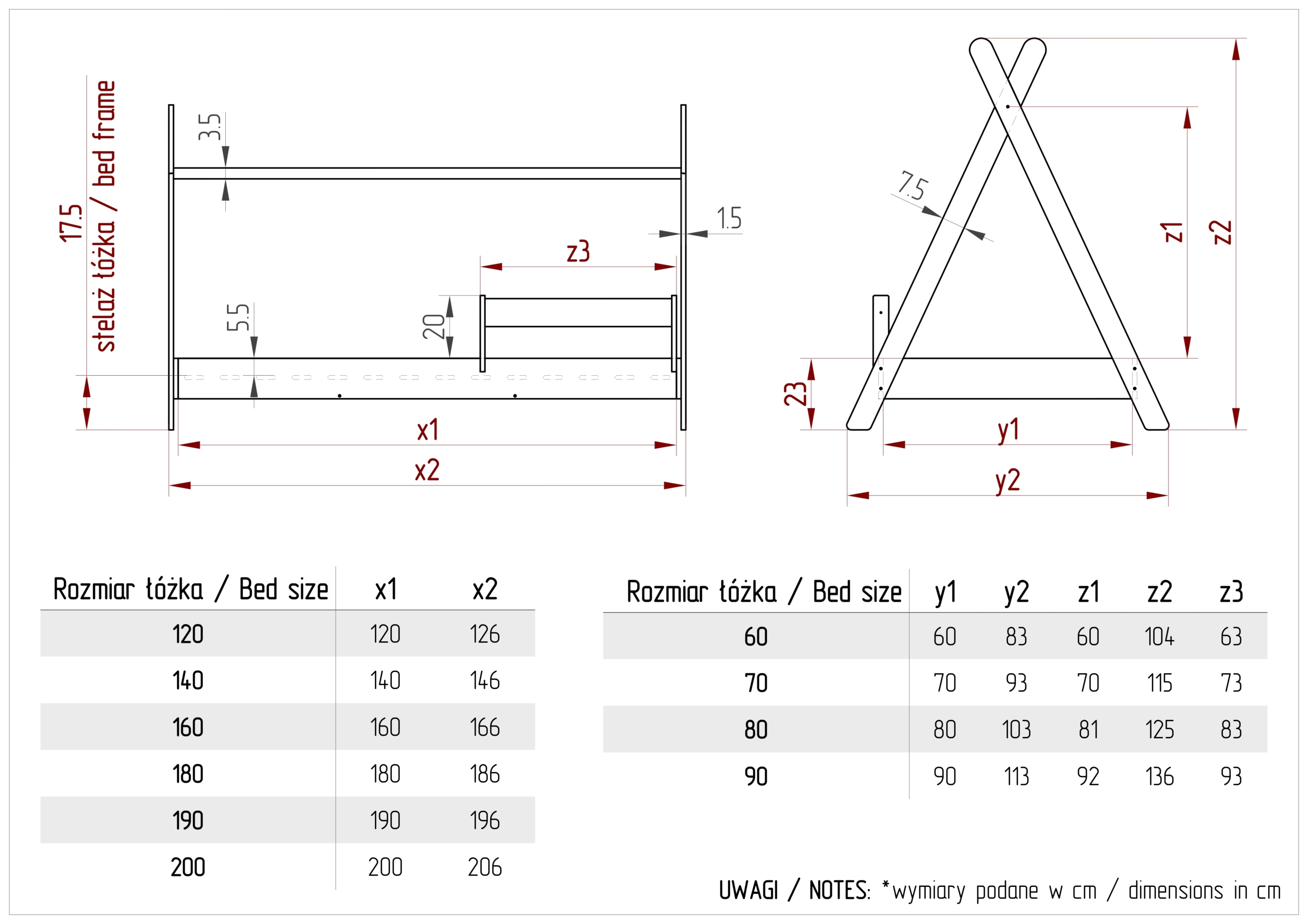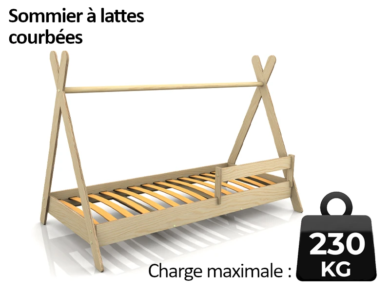 Le modèle TIPI convient aussi bien aux jeunes enfants qu’aux plus grands. Un sommier robuste est inclus dans l’ensemble, pouvant supporter une charge maximale jusqu’à 230 kg, assurant ainsi une utilisation immédiate après assemblage.
