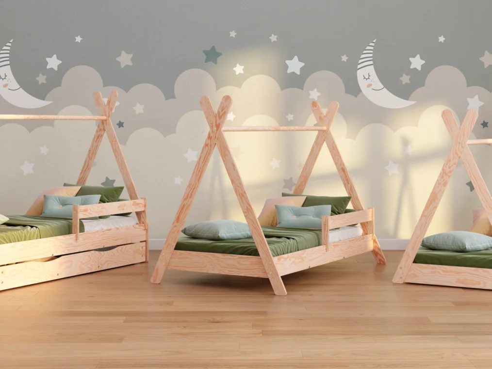 Trois types de lits en bois de style tipi en contreplaqué de pin de couleur bois naturel avec des barrières latérales