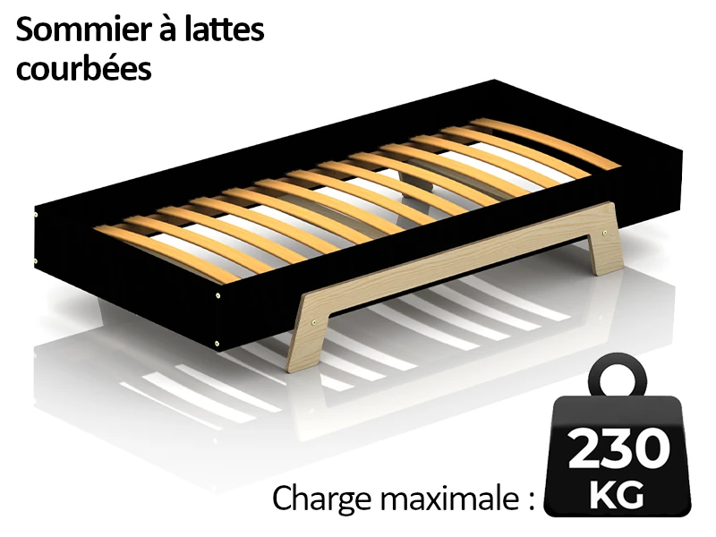 Fabriqué en contreplaqué de pin de haute qualité, il est disponible en 11 couleurs et 13 tailles. Le sommier, inclus dans l’ensemble, supporte une charge maximale allant jusqu’à 230 kg, permettant ainsi une utilisation immédiate dès l’assemblage.