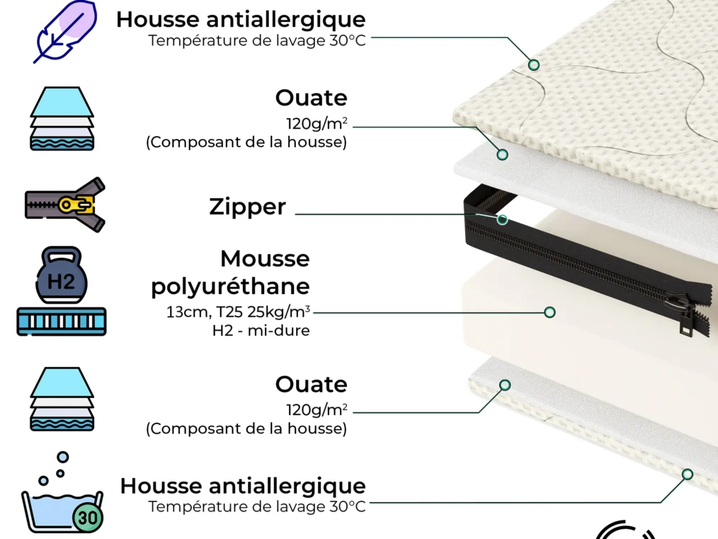 Grâce à une fermeture éclair, la housse peut être retirée rapidement et lavée à 30 °C, permettant de maintenir le matelas dans un état de propreté impeccable.