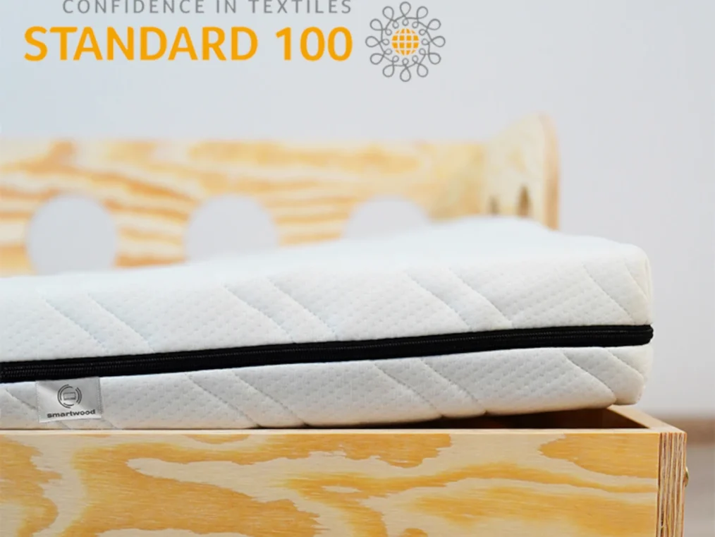 Les certifications CertiPUR™ et OEKO-TEX Standard 100 garantissent que le produit est sûr pour les enfants et exempt de substances nocives. La housse matelassée avec ouate antiallergique (120 g/m²) est facile à retirer et lavable en machine.